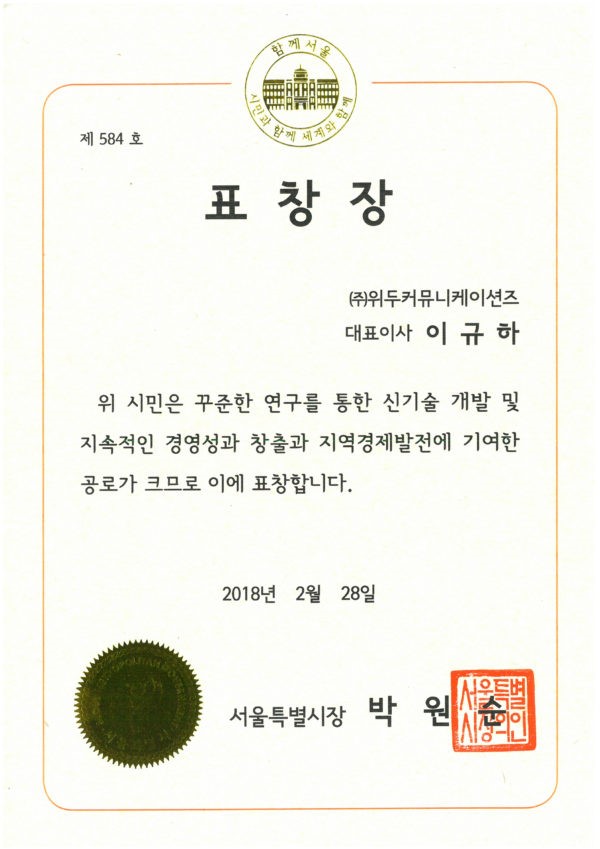 서울특별시장 표창장 페이지 정보 작성자 WeDu 댓글 0건 조회 6,815회 작성일 19-05-30 19:35 본문 2018-02-28 표창장 제 584호 신기술 개발 및 지속적인 경영성 창출, 지역 경제 발전 기여 서울특별시장 박원순 List Previous2018 소년한국 우수 어린이 도서 19.05.30 Next서울클러스터 어워드 우수상 19.05.30