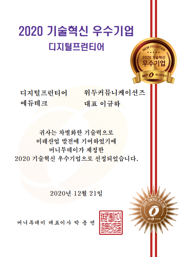 2020 기술혁신 우수기업 페이지 정보 작성자 WeDu 댓글 0건 조회 6,271회 작성일 21-12-31 12:58 본문 2020-12-21 2020 기술혁신 우수기업 디지털프런티어 에듀테크 머니투데이 대표이사 List Previous2020 소년한국 우수 어린이 도서 선정 21.12.31 Next2020 서울산업진흥원 2020 DMC어워드 21.12.31