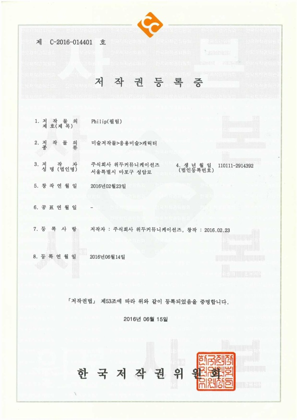 [한국/저작권] 필립 페이지 정보 작성자 WeDu 댓글 0건 조회 6,079회 작성일 19-05-30 19:09 본문 2016-06-14 저작권 C-2016-014401 필립 / 미술저작물>응용미술>캐릭터 List Previous[한국/저작권] 월터 19.05.30 Next[한국/저작권] 아리스 19.05.30