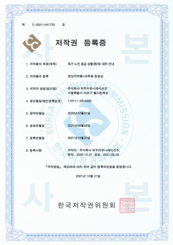 [한국/저작권] 독거 노인 응급 상황(화재) 대피 안내 페이지 정보 작성자 WeDu 댓글 0건 조회 6,541회 작성일 21-12-31 12:41 본문 2021-10-21 저작권 C-2021-041725 영상저작물>교육용 동영상 List Previous[한국/저작권] 장보기 인지훈련 게임 21.12.31 Next[한국/저작권] OLL KIDS/MATH 21.12.31