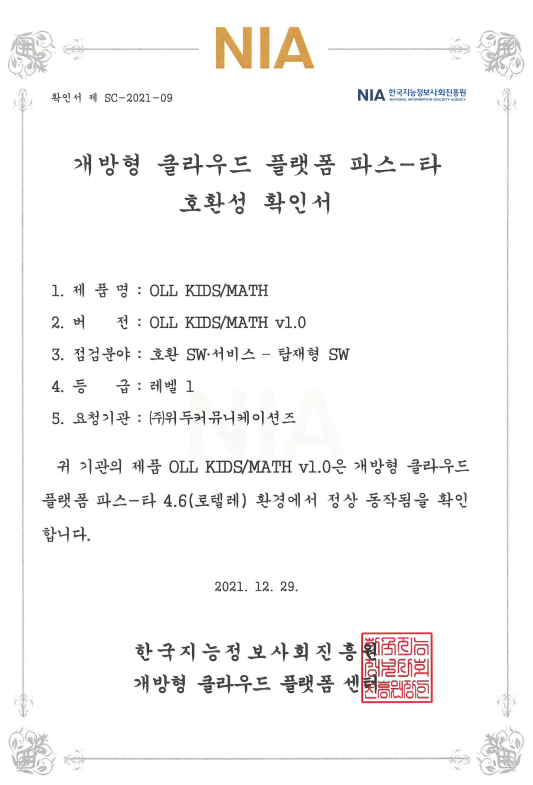 [한국/확인서] OLL KIDS/MATH 파스-타 호환성 확인서 페이지 정보 작성자 WeDu 댓글 0건 조회 10,487회 작성일 21-12-31 12:48 본문 2021-12-29 확인서 제 SC-2021-09 점검분야 : 호환 SW서비스 - 탑재형 SW List Next[한국/인증서] OLL KIDS/MATH 클라우드 서비스 확인서 21.12.31